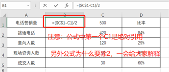 2、在B1单元格输入公式=($C$1-C1)/2,注意第一个C1需要绝对引用