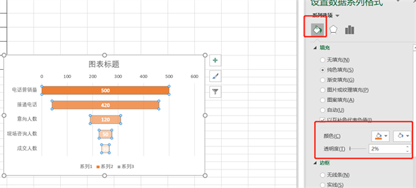 为了让图表看起来更美观,我们还可以按下图方法,把图表通过“透明度”改成递进的颜色。
