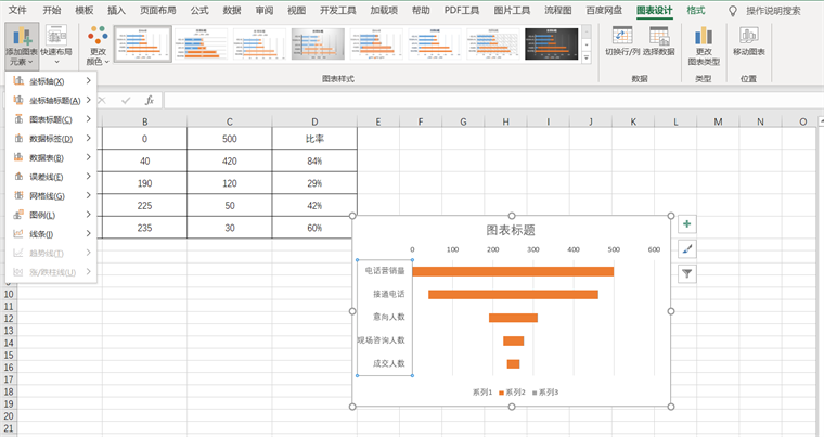 操作步骤:图表设计——颜色更改、添加图表元素等