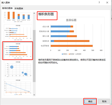 5、系统自动调出“插入图表”对话框——选择“堆积条形图”——点击“确定“,如下图所示: