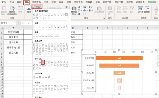 操作方法:插入——形状——找到向下的箭头,进行插入,如下 图所示: