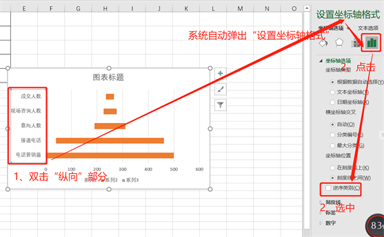 9、双击“纵向坐标轴”——系统自动弹出“设置坐标轴格式”——按图示,选择“逆序类别”