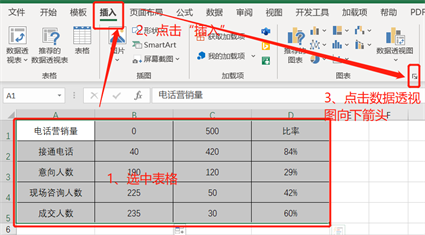 4、选中表格——点击“插入”——点击“数据透视图向下的箭头”,如图所示: