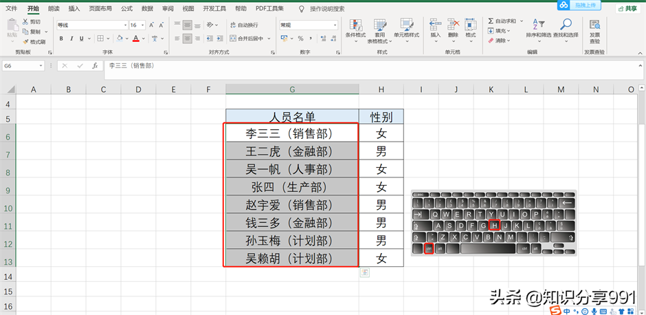 首先需要框选需要设置的区域范围,将人员名单这一列全部选中并按键盘上的组合键”Ctrl H”快捷键。