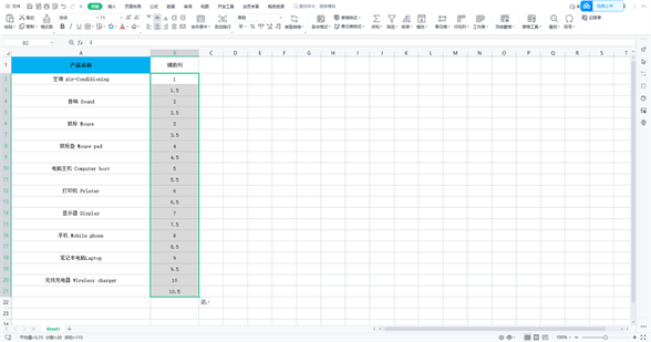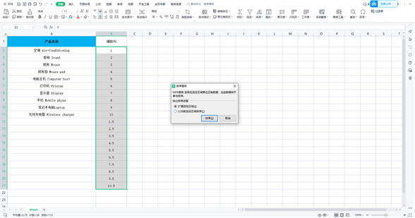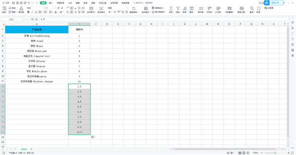2、接下来我们继续在辅助列序号时,后面输入1.5-10.5的排列序号,这里我们输入的数字与(B2:B11)单元格呈等差数列,辅助列的序号全部设置好后