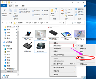 (3)打开产品图片所在的文件夹,然后点击右键,在弹出菜单上面单击“排序方式”选项,接着单击“递增”对产品图片名称按递增进行排序,如下图所示。
