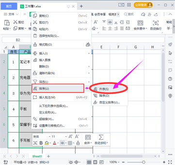 (2)然后点击右键,在弹出菜单上面单击“排序”选项,接着单击“升序”对产品名称按升序进行排序。