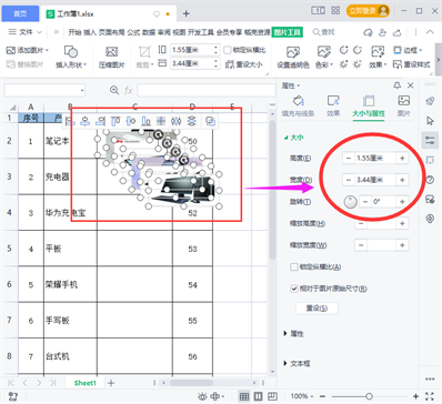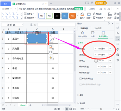 (4)确定图片统一尺寸大小,可在图片单元格里面先插入一个矩形并调至合适大小,看一下它的尺寸并记下来,最后删除该矩形。