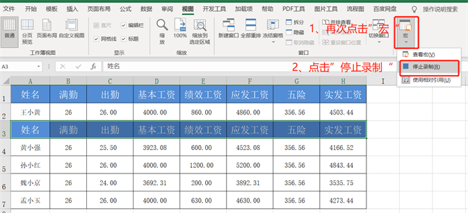 7、再次点击“宏”下拉三角——点击“停止录制”,如下图所示: