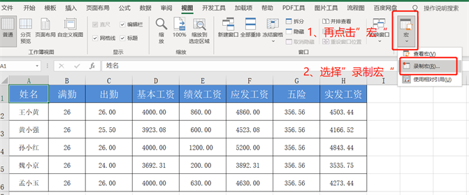 2、再次点击“宏”下拉三角——选择“录制宏”,如下图所示: