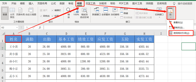 1、选中A1单元格——点击“视图”——点击“宏”下拉三角——选择“使用相对引用”,如下图所示: