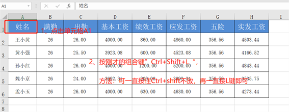 9、点击“A1单元格”——再一直按刚才自己设置的组合键“Ctrl+shift+L”。