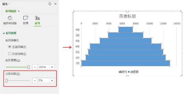 选择蓝色条形图,快捷键”Ctrl+1″,调出格式窗口,选择系列—分类间距,设置为0。