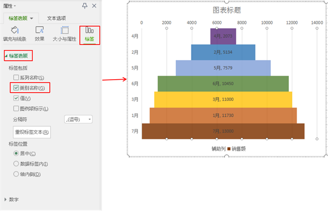 选中图表,右键添加数据标签,选中数据标签,快捷键”Ctrl+1″,调出格式窗口,标签选项,勾选”类别名称”。