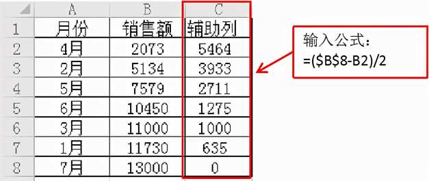 插入辅助列,输入公式:”=($B$8-B2)/2″。