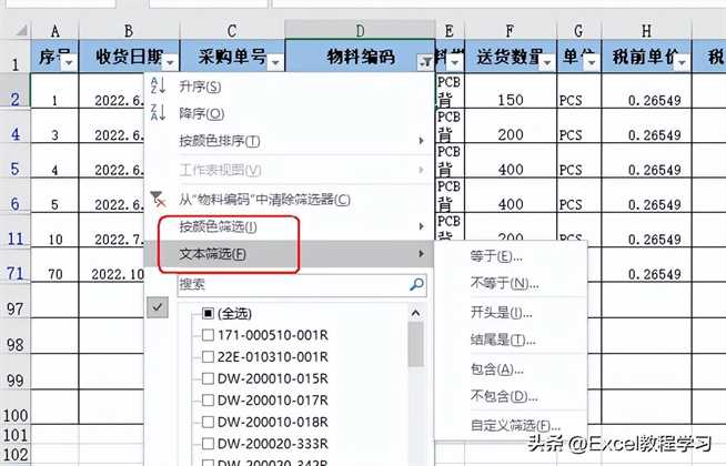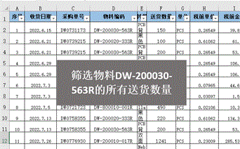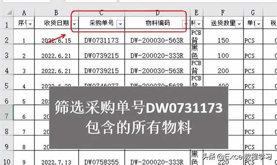 首先来看第一个示例,要筛选采购单号为“DW0731173”的所有物料送货信息。