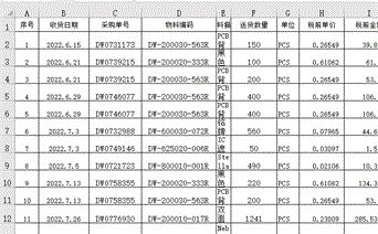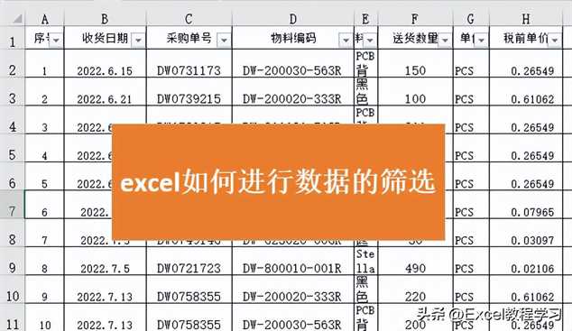 以下方数据表为例,这是一个物料采购送货的记录表,由于记录信息比较多,使用鼠标滑动来查看数据非常不方便,因此我们将利用筛选功能来查看送货信息。