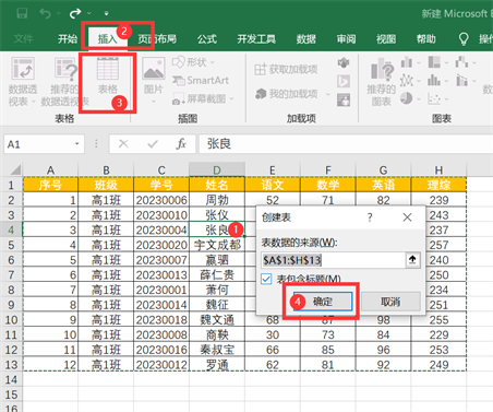 (数据区域任意单元格——插入——表格——核对创建超级表的数据来源区域——确定)