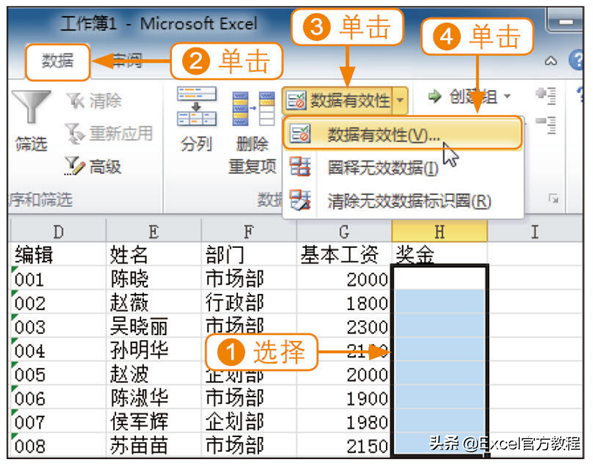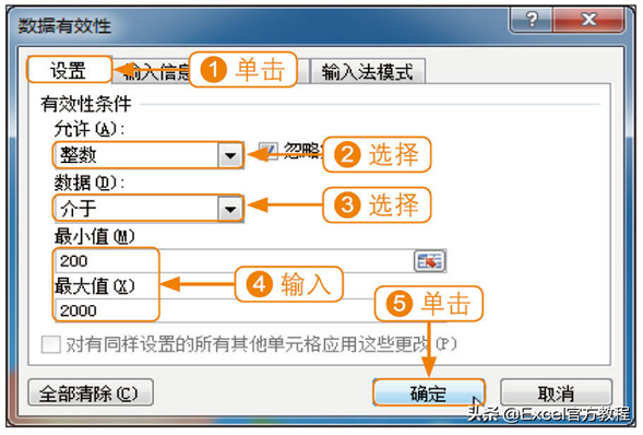 最佳答案操作方法和步骤:步骤01 ①选择要设置数据有效性的单元格区域;②单击“数据”选项卡;③单击“数据工具”工具组中的“数据有效性”按钮;④在列表中单击“数据有效性”命令,打开“数据有效性”对话框,如下图所示。步骤02 在“数据有效性”对话框中①单击“设置”选项卡;②在“允许”下拉列表中选择“整数”或“小......