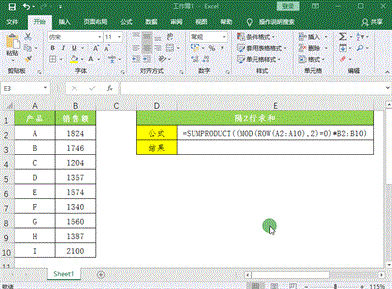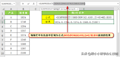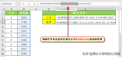 下图是一个产品销售表,如果求出所有偶数行的和,公式应该怎么写?