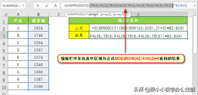 SUMPRODUCT函数的作用是:在给定的几组数组中,将数组间对应的元素相乘,并返回乘积之和。第2步返回的逻辑值数组TRUE=1,FALSE=0,可知第2步的结果也等于{1;0;1;0;1;0;1;0;1}。B2:B10单元格区域为{1824;1746;1204;1357;1574;1340;1560;1387;2100},将数组间对应的元素相乘,得到结果{{1824;0;1204;0;1574;0;1560;0;2100}},最后再将数组里面的值相加,即可得到E3单元格的结果“8262”。
