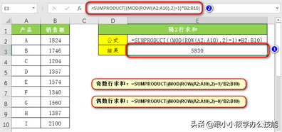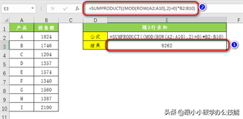 1、选中E3单元格 — 在编辑栏中输入公式“=SUMPRODUCT((MOD(ROW(A2:A10),2)=0)*B2:B10)”– 按回车键回车即可。