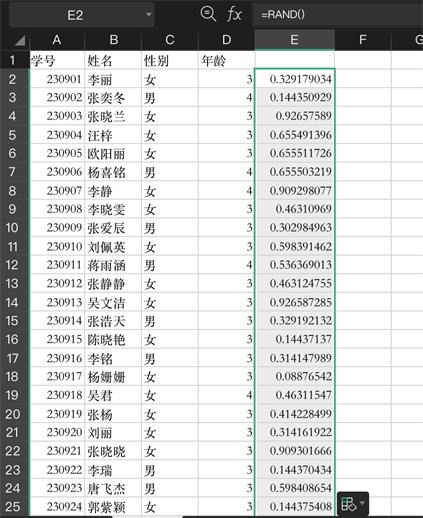 execl中有一个rand()函数,它可以随机产生一个大于等于0小于1的小数,只要在表格中最后一列数据之后的空白列的第一个单元格中输入“=rand()”,回车后会看到单元格中显示了一个随机小数。