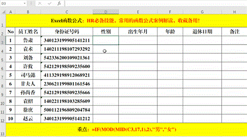 在目标单元格中输入公式:=IF(MOD(MID(C3,17,1),2),”男”,”女”)。