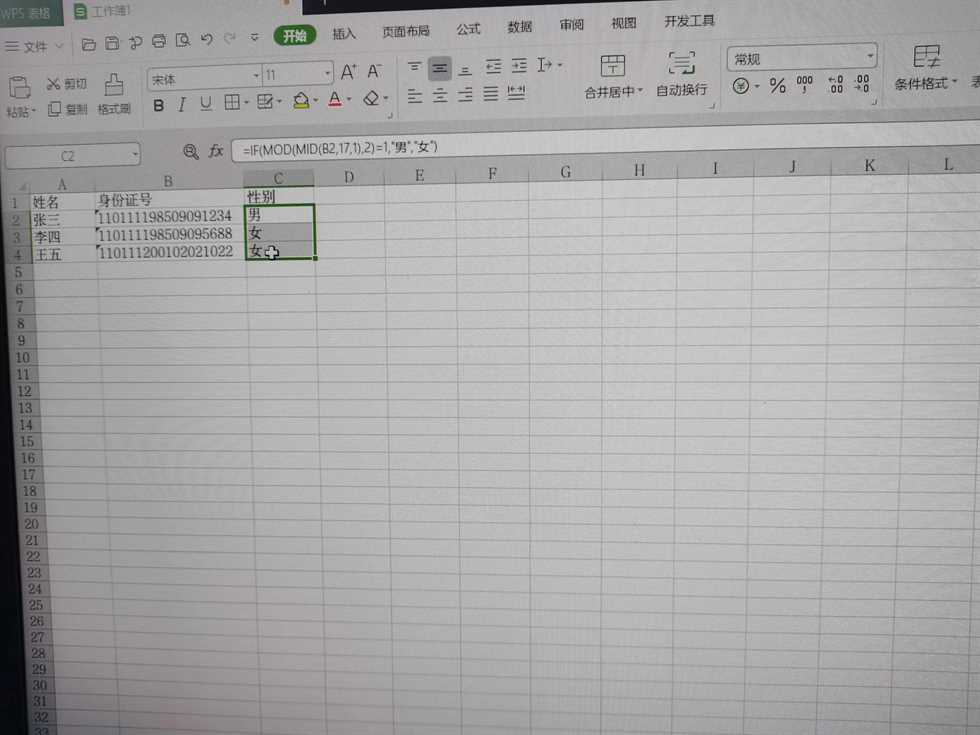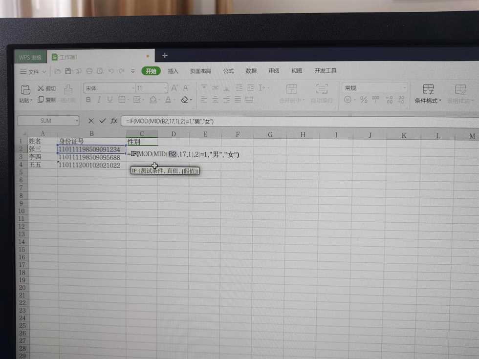 第二步:根据单元格位置,输入函数=IF(MOD(MID(B2,17,1),2)=1,”男”,”女”),如图所示。