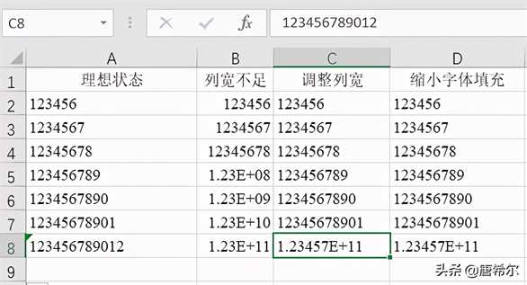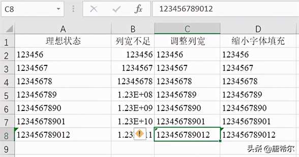 但是无论是调整列宽,还是缩小字体填充,仍有部分数据无法正常显示,如下图C8、D8单元格