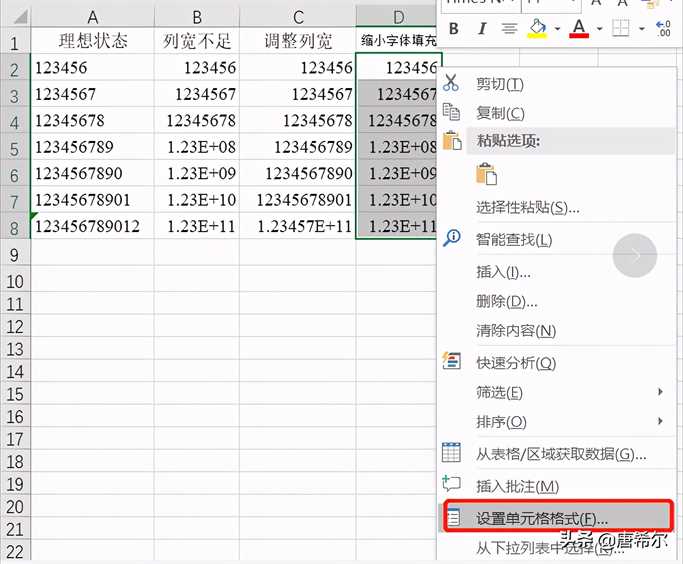 最佳答案原因1和解决方法首先可能是单元格列宽不足(如下图B列),最快速的解决方法是调整列宽(如下图C列),如果对列宽有特殊要求,可以选中相应区域,点击右键—设置单元格格式打开“对齐”选项卡,勾选文本控制下的“缩小字体填充”,点击确定按钮保存设置。但是无论是调整列宽,还是缩小字体填充,仍有部分数据无法正常显示......