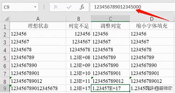 在“常规”格式下,当数字位数超过15位时,仅可显示左侧15位的数字,其余部分的数字则变为零