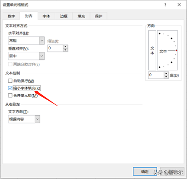 打开“对齐”选项卡,勾选文本控制下的“缩小字体填充”,点击确定按钮保存设置。