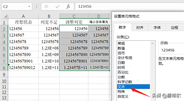 首先可能是单元格列宽不足(如下图B列),最快速的解决方法是调整列宽(如下图C列),如果对列宽有特殊要求,可以选中相应区域,点击右键—设置单元格格式