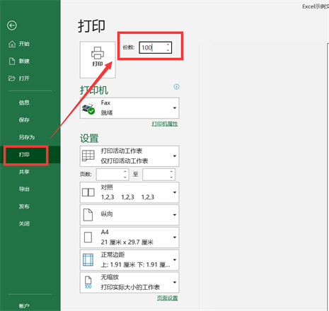 最佳答案1、打开Excel文档,找到最上方的菜单栏中【文件】菜单,单击它,如下图所示。2、单击【文件】后,找到【打印】选项,并单击它,得到如下图所示的页面。3、第一项需要我们具体设置的就是最上方份数选项,默认地打印1份,你可以具体更改到自己想要的份数,如下图所示。4、第二项需要我们具体设置的就是打印机选项,......