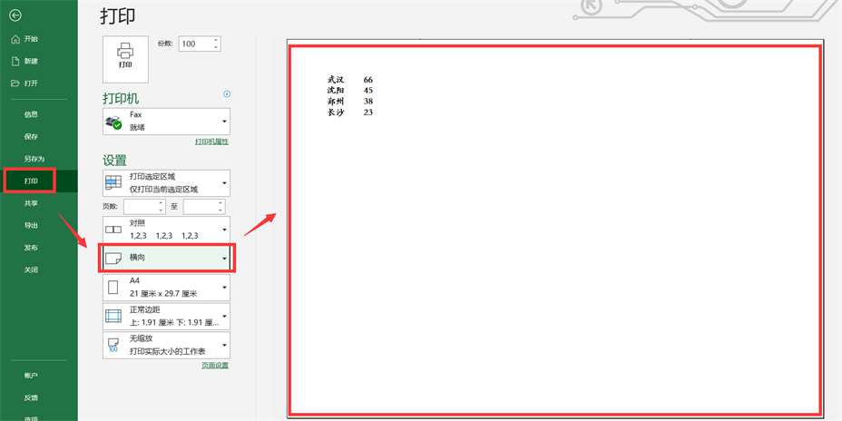 15、第五项需要我们设置的是【页面方向】,即【纵向】打印还是【横向】打印,刚刚我们看到的预览页面都是默认的【纵向】,如果我们调整为【横向】,则会展示如下图的状态。