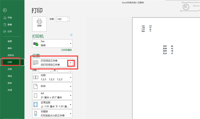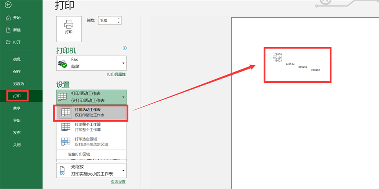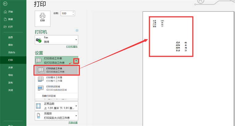 6、第一个打印选项为【打印当前工作表】,如下图所示,也就是我们正在用的那个工作表。