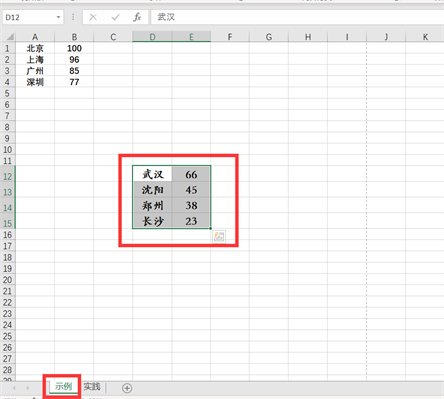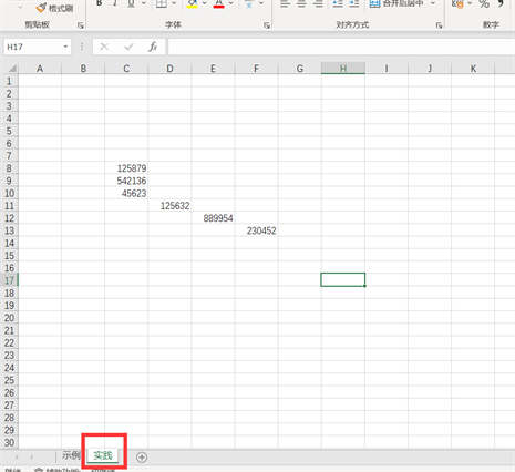 7、如果我们改变当前工作表,刚才的当前工作表为【示例】表,现在我们改成【实践】表,如下图所示,再执行【打印当前工作表】时,打印的内容就会出现变化。