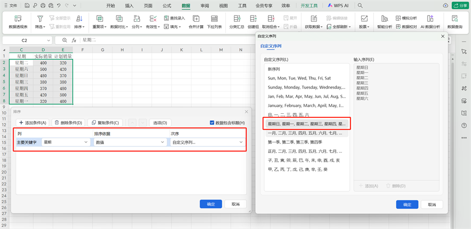 最佳答案一、排序混乱原因Excel对文本类数据默认采用“拼音首字母排序”规则。而“星期几”的拼音首字母顺序(如“星期五”在前、“星期三”在后),与我们习惯的“周一到周日”顺序完全不符,这就导致直接排序时出现混乱。二、用自带序列初步排序1.若已制作包含星期的图表(如簇状柱形图),需先确认“实际销量”列在“计划......