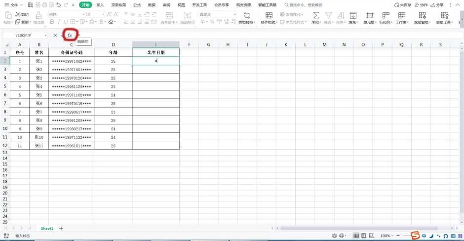 第一步,在需要提取出生日期的单元格内输入“=”;