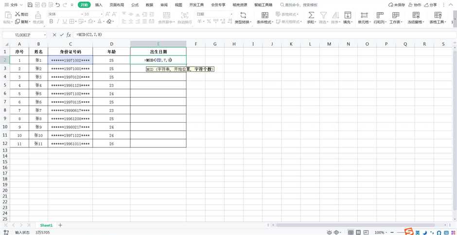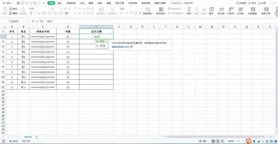 第一步,在需要提取出生日期的单元格内输入“=MID”;