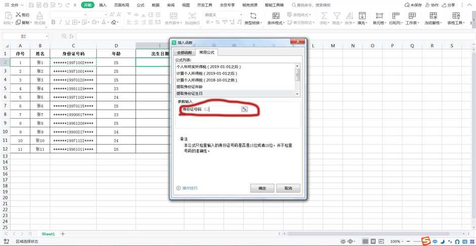 第二步,点击上方fx,选择常用公式中的提取身份证生日;