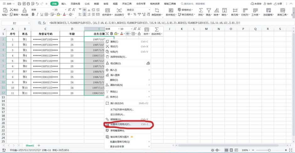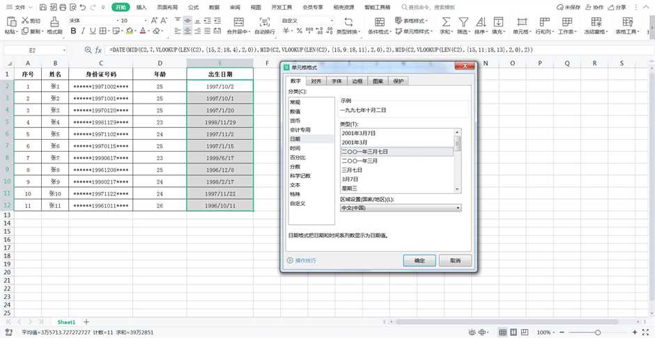 第五步,选中提取的出生日期单元格,鼠标点击右键,在“设置单元格格式中”选择“数字-分类-日期”,按照需求选择相应的日期格式。