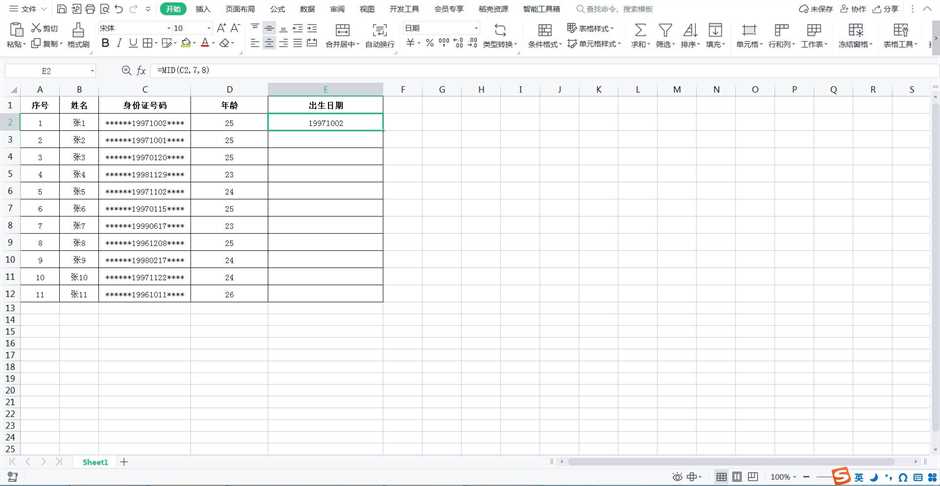 第四步,出生日期提取出来后,将鼠标放置在单元格右下,待鼠标变为实心黑色十字后,下拉或双击,完成全部身份证号码提取。