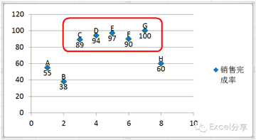 Step 2、生成图表后我们调整散点图标颜色,然后添加员工姓名与销售完成率数据标签。
