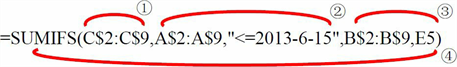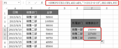 =SUMIFS(C$2:C$9,A$2:A$9,”<=2013-6-15″,B$2:B$9,E5)