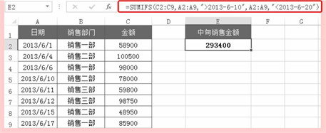 按“Enter”键即可统计出2013年6月中旬的销售总金额,如图2所示。