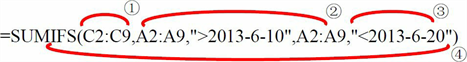 =SUMIFS(C2:C9,A2:A9,”>2013-6-10″,A2:A9,”<2013-6-20″)