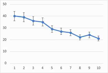 您创建的图表中的误差线可以帮助您快速查看误差幅度和标准偏差。 误差线可以在数据系列中的所有数据点或数据标记上显示为标准误差量、百分比或标准偏差。 您可以设置自己的值以显示所需的确切误差量。 例如,您可以在如下所示的科学实验结果中显示 10% 的正负误差量: