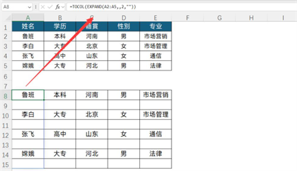 若要为数据中的每一行批量插入一个空白行,可使用公式:=TOCOL(EXPAND(A2:A5,,2,””))